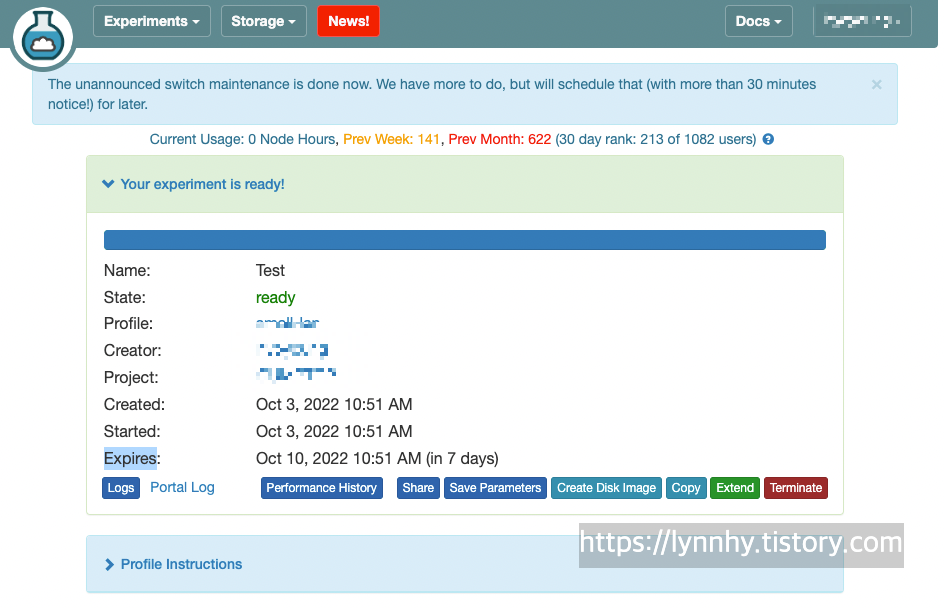 인스턴스가 생성이 되면 사용할수 있는 시간은 Expires 항목에서 확인 가능하다. 처음 생성 시는 16시간인데, Extend 버튼을 눌러 내가 이 프로젝트를 하기 위해 이 인스턴스가 왜 필요한지 이유를 적으면 연장이 가능하다. 7일까지는 자동으로 연장이 가능하고 그 이상 연장을 위해서는 관리자의 허가가 필요하고 허가가 안될 가능성이 높다. 최대 30일까지 반복적으로 연장이 가능하지만 그 이후에는 연장이 안되어 없앤 뒤 새로 인스턴스를 만들어야 한다.